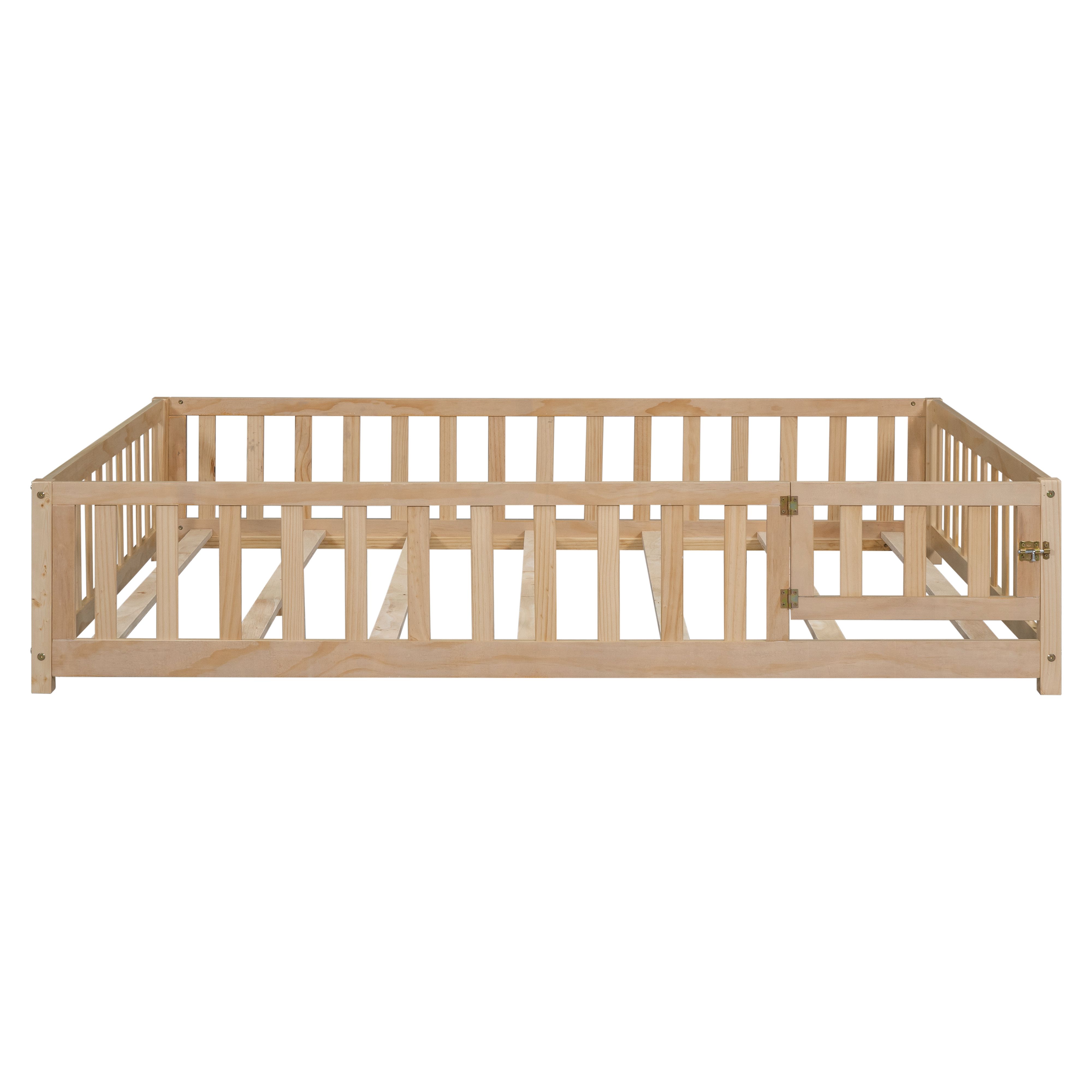 Full Size Floor Platform Bed with Fence and Door for Kids, Montessori Floor Bed Frame with Support Slats for Toddlers, Wooden Floor Bed Natural