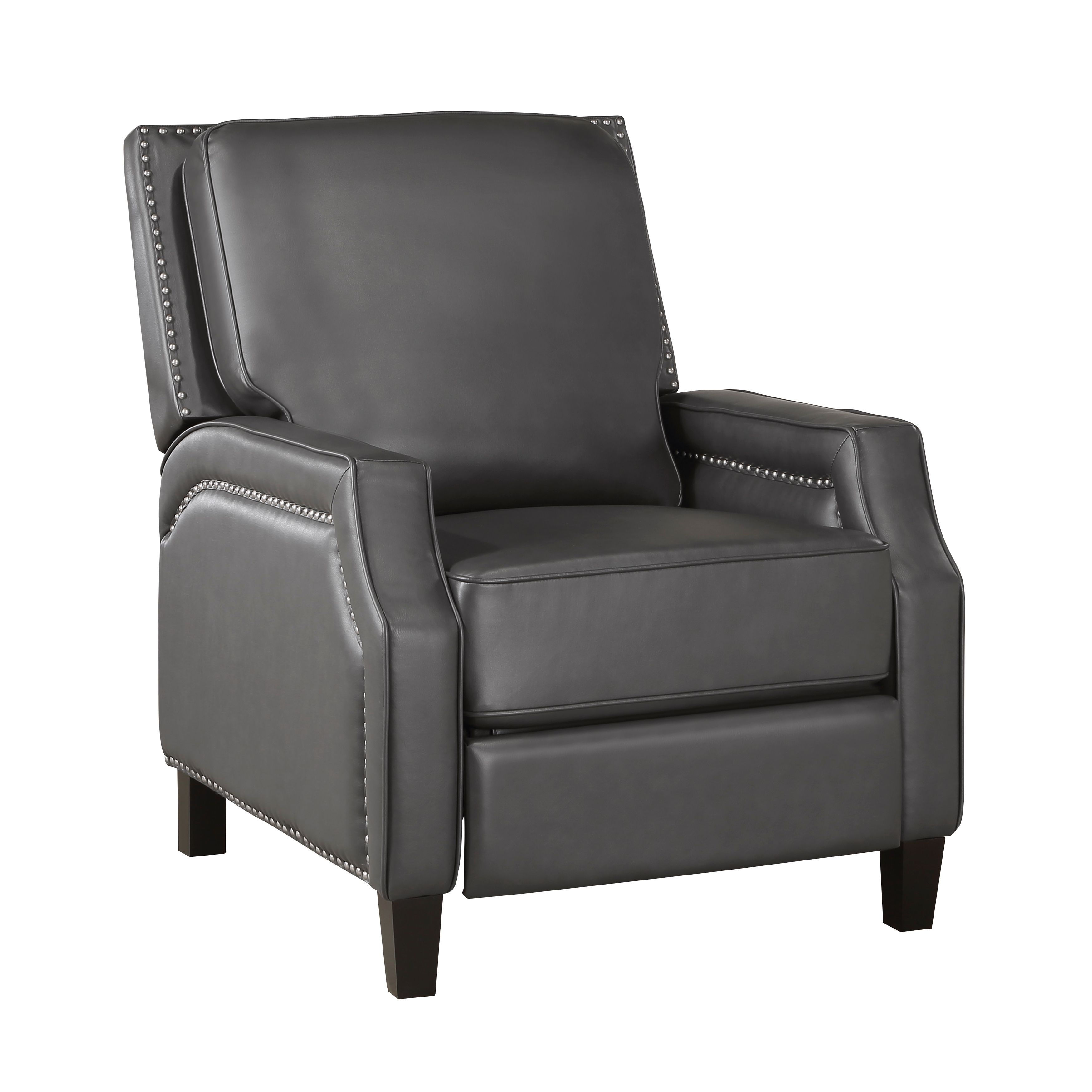 With a reclining mechanism that is engaged with your push, settling into the Berenson Collection is done so with ease. The tailored profile of the push back reclining chair is covered in gray faux leather and features nail head trim, lending to its transitional style, creating the perfect complement to your homes décor.