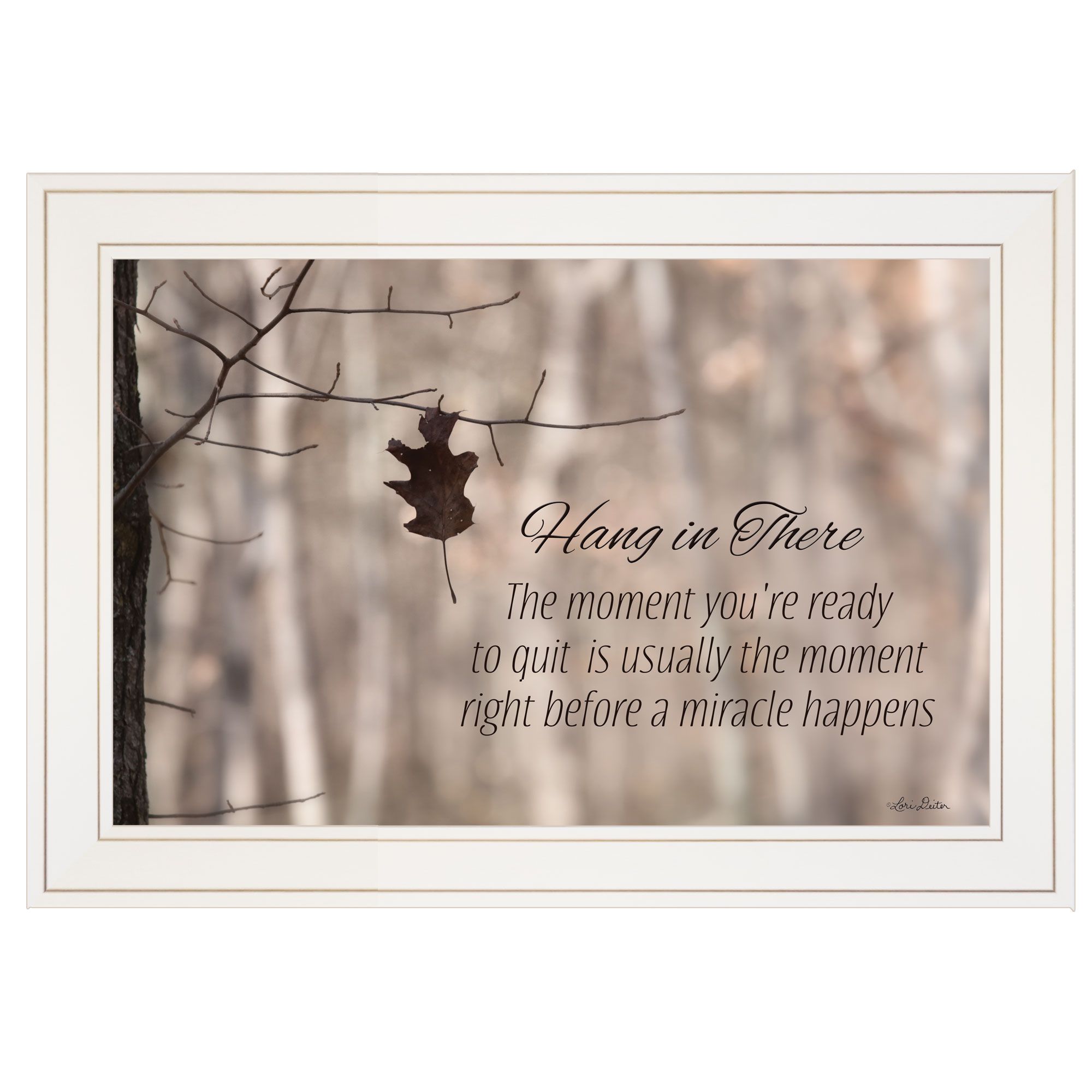 LD1172-226G Hang in There! By Lori Deiter. This decorative white framed print (21x15) is a reminder for us not to give up. The surface of the print is textured with a fade resistant coating so no glass is necessary. The surface of the print is textured with a fade resistant coating so no glass is necessary. Arrives ready to hang. Made in the USA by skilled American workers. •TEXTURED ARTWORK with a 'rolled on' acid-free acrylic coating to create a canvas painting effect.•UV PROTECTANT COATING protects artwork from fading. No glass is necessary.• MOULDING adds natural beauty to the framed art. Frame is keyholed for the easy hanging.•THIS FINE HOME DECOR piece made in the USA by Woman Owned Business (WBE) is a perfect gift for a friend or relative.