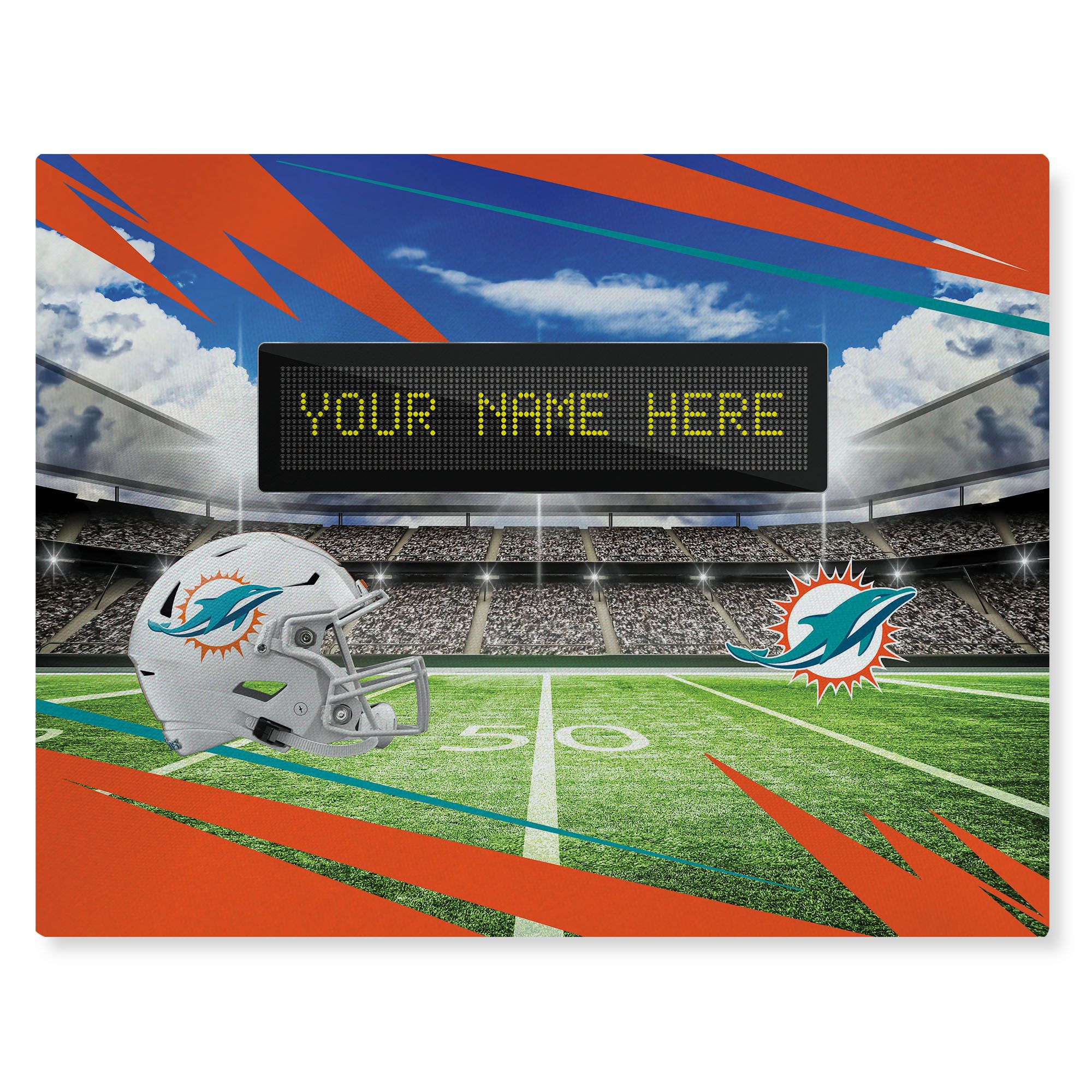 Features a football stadium, helmet and your favorite team's logo with a scoreboard ready for your personalization