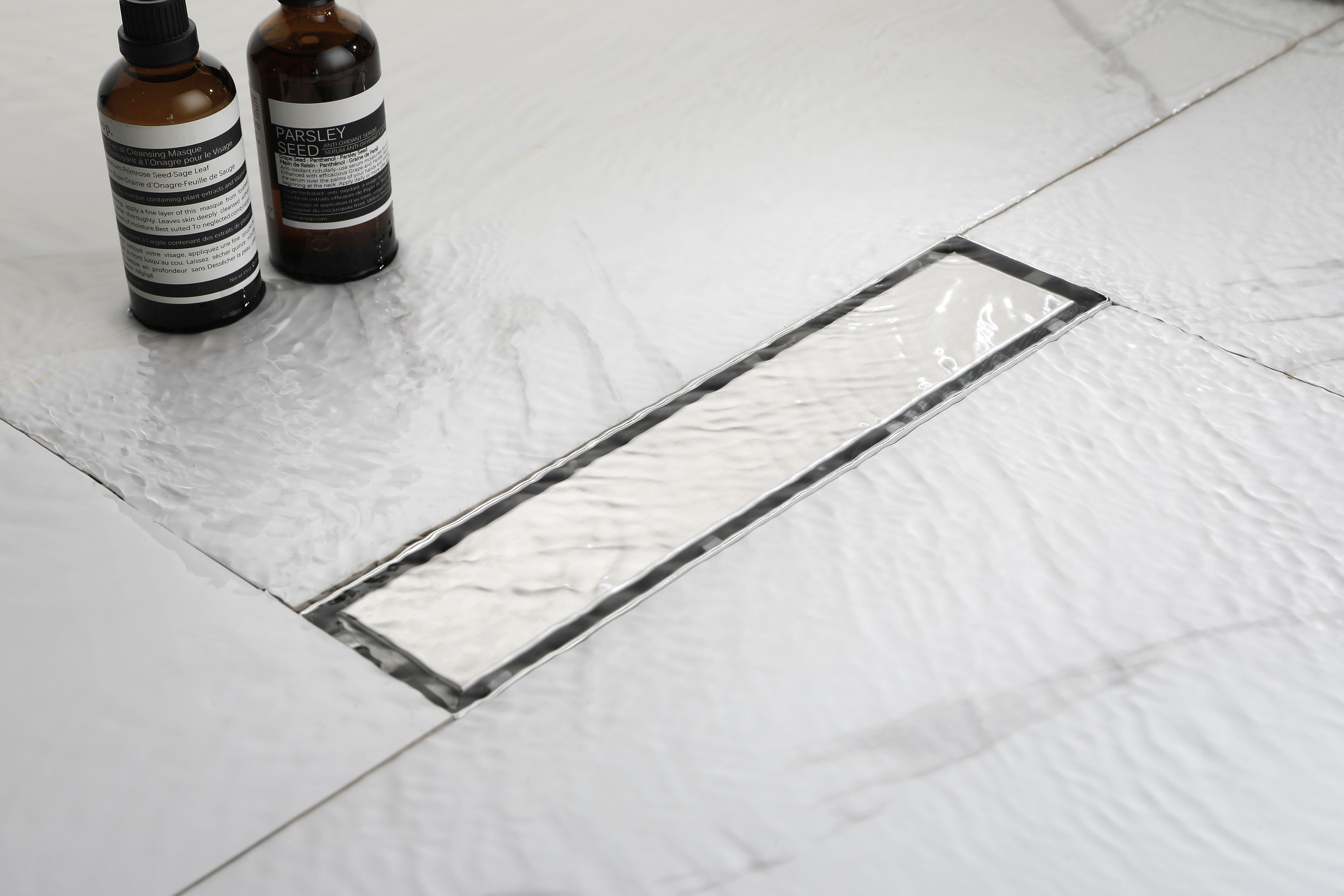 Linear shower drains have a shallow "V" profile that helps water flow quickly toward the center drain, reducing residual moisture at the bottom.