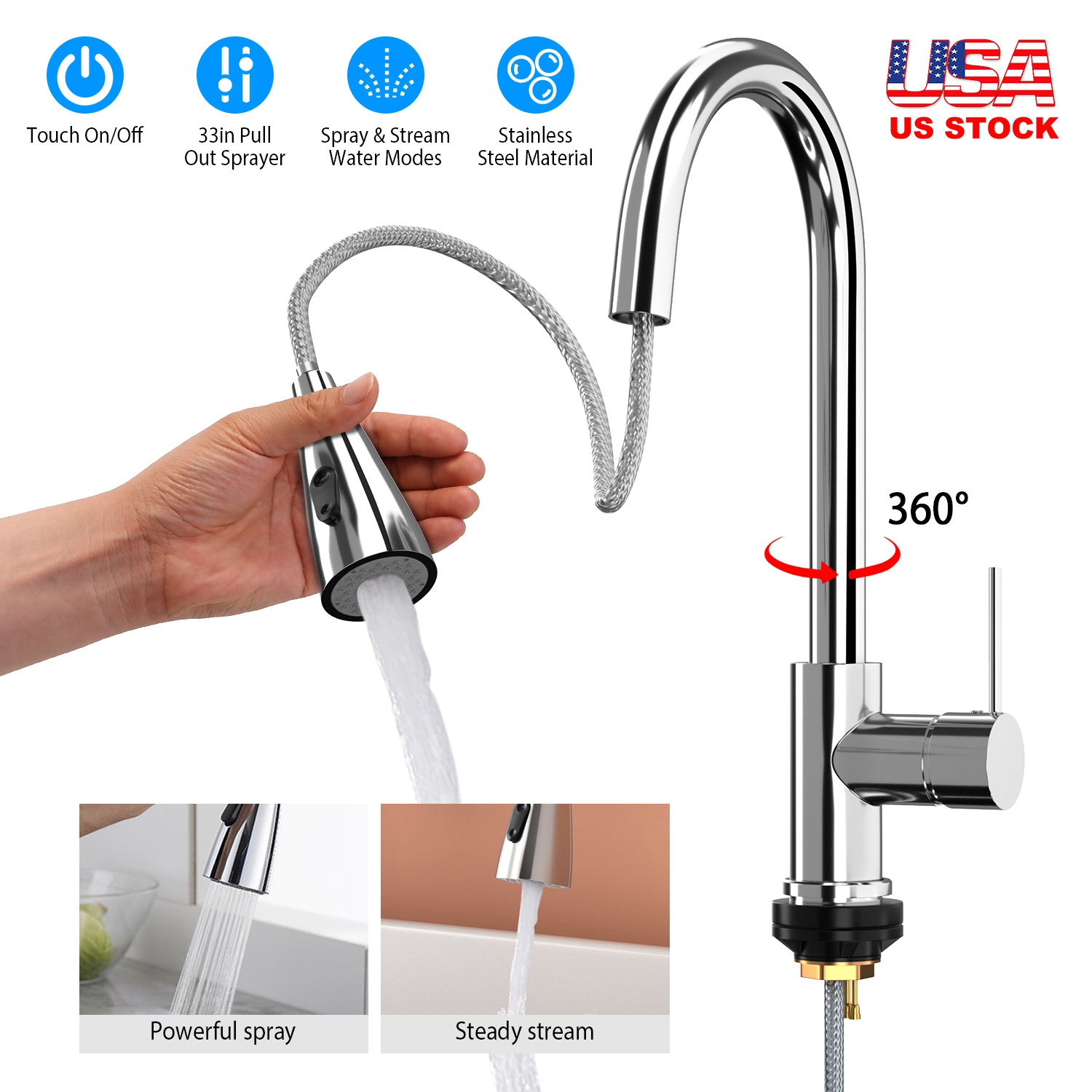 This touch sensor faucet is one that you can turn on and off merely by touching any point on the faucet with your wrist or forearm. It can also turn off automatically in 30S. It’s equipped with a button on the spout to freely convert two water flow modes (powerful spray mode and steady stream mode) according to your needs. Besides, you can save your time to do a convenient cleaning with its 360°rotatable and flexible pulling-out head to increase water cover range.
